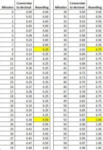 Clock time (minutes after the hour) punch clock time is rounded to. To quickly calculate what to charge for portions of an hour worked, use the chart below as a reference. Your four possibilities are 0.25 (15 minutes after the hour), 0.50.